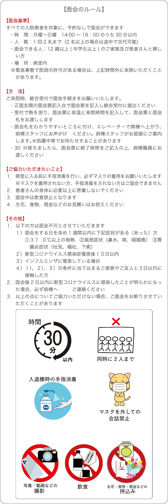 当院では 感染拡大予防に努めており「面会のルール」を設けております。ご面会の際には以下を遵守いただきますようご協力をお願いいたします。